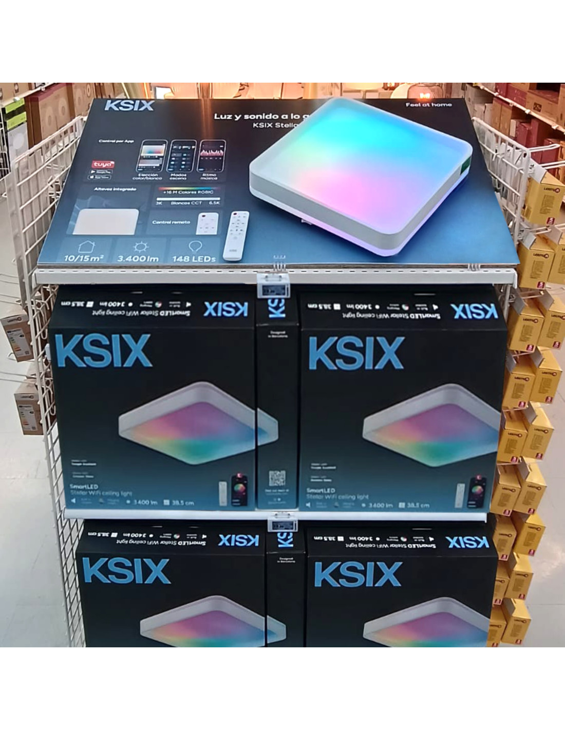 Support designed to display the KSIX Celeste ceiling light at the point of sale, fixing the product directly onto the panel. It presents essential information to highlight its advantages and facilitate the end customer's choice.