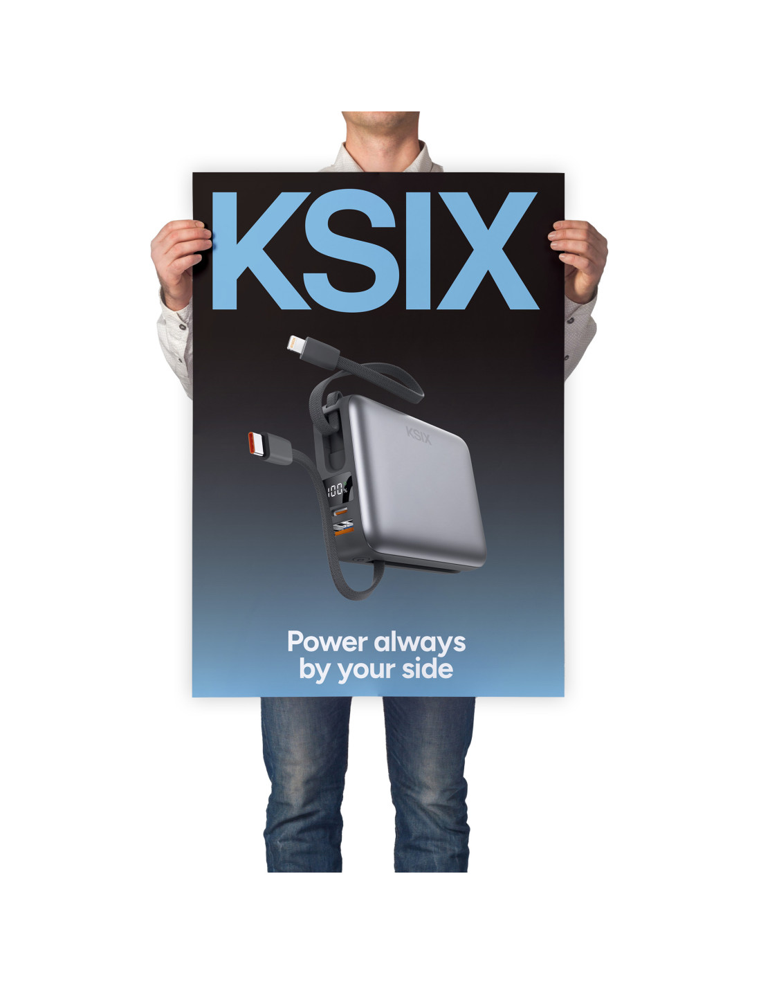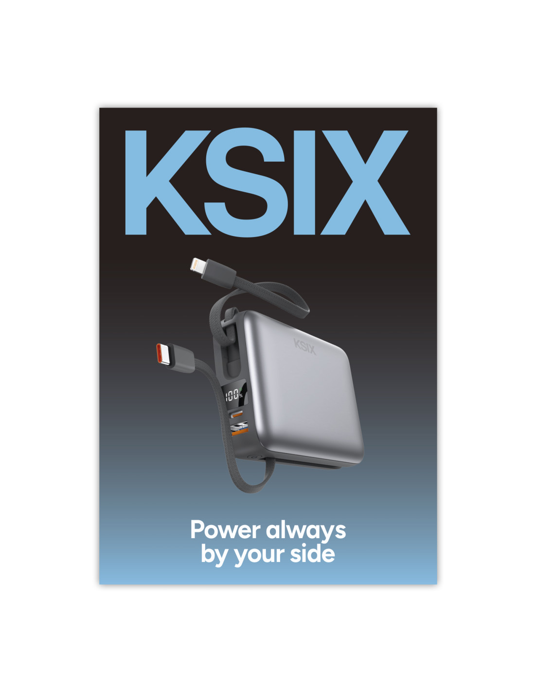 KSIX poster to highlight the power banks range at the point of sale. Its design reinforces the brand image and attracts the end consumer, increasing the visibility and sales of KSIX products.