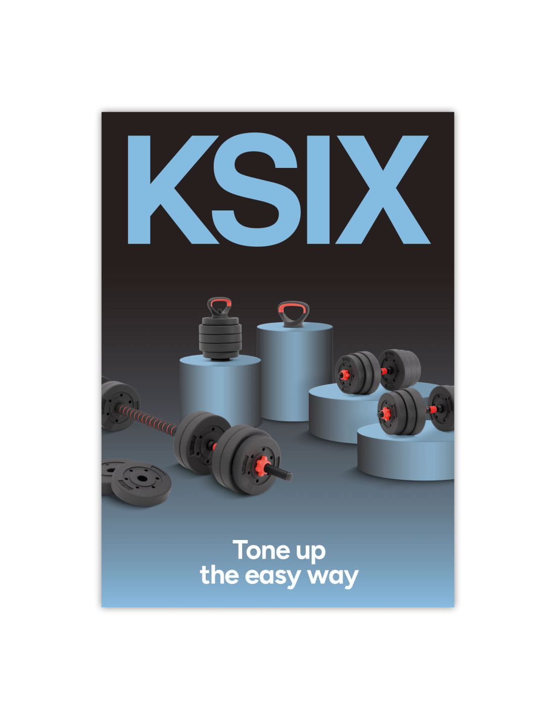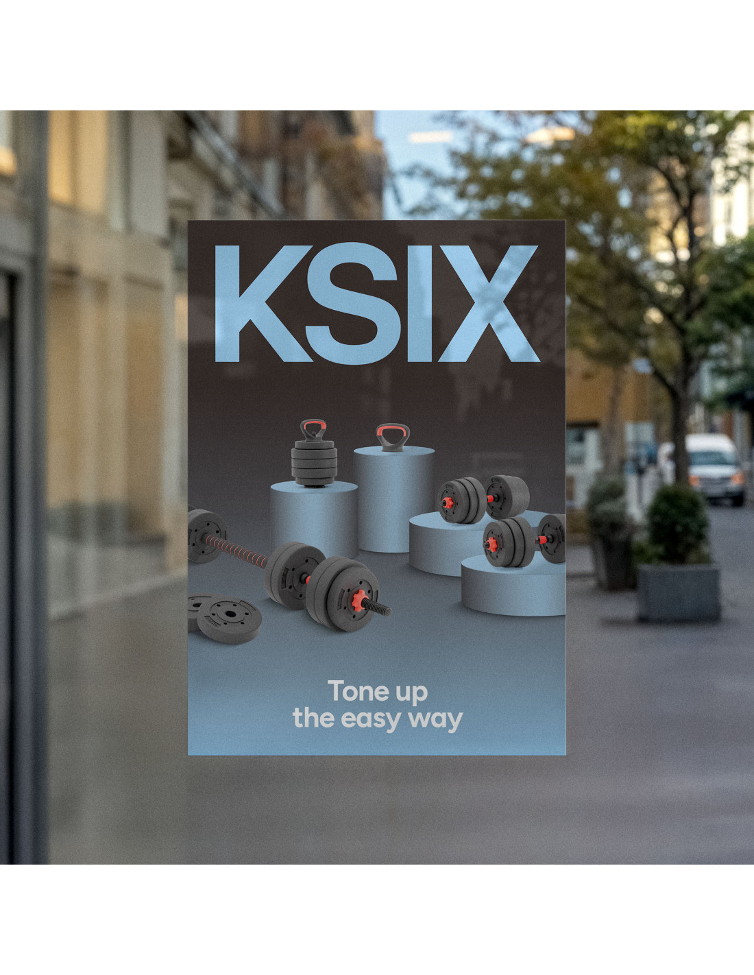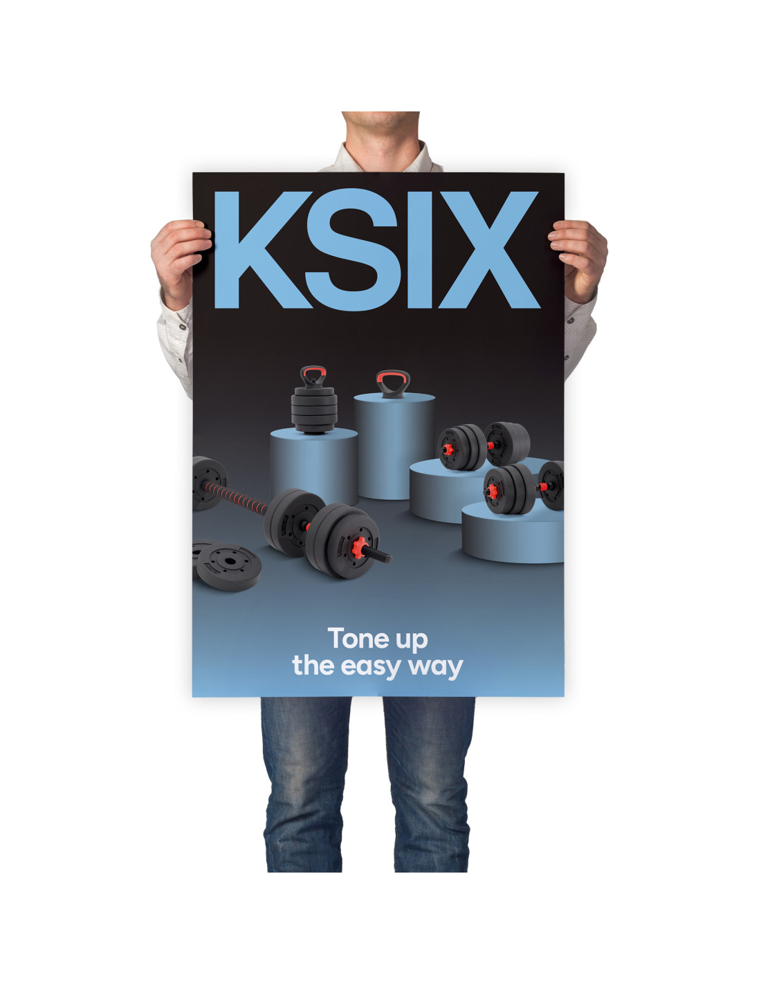 KSIX poster to highlight the Fitness range at the point of sale. Its design reinforces the brand image and attracts the end consumer, increasing the visibility and sales of KSIX products.
