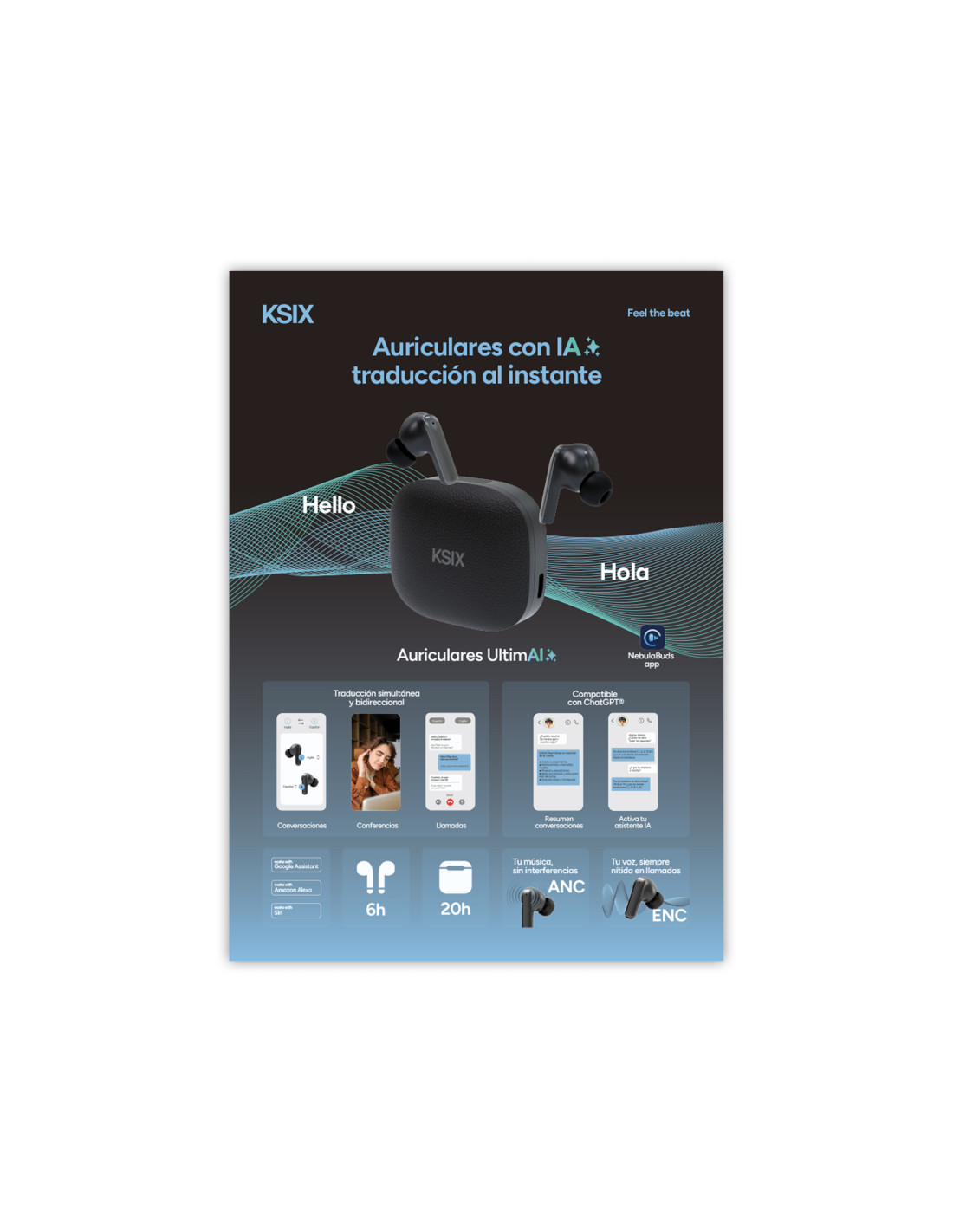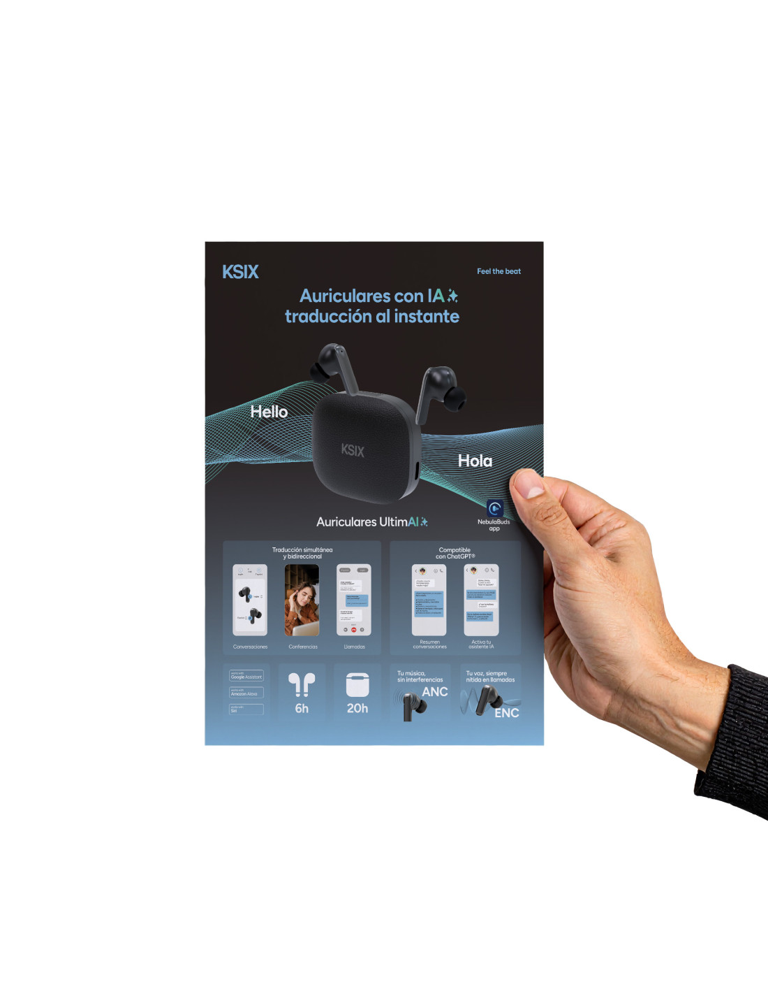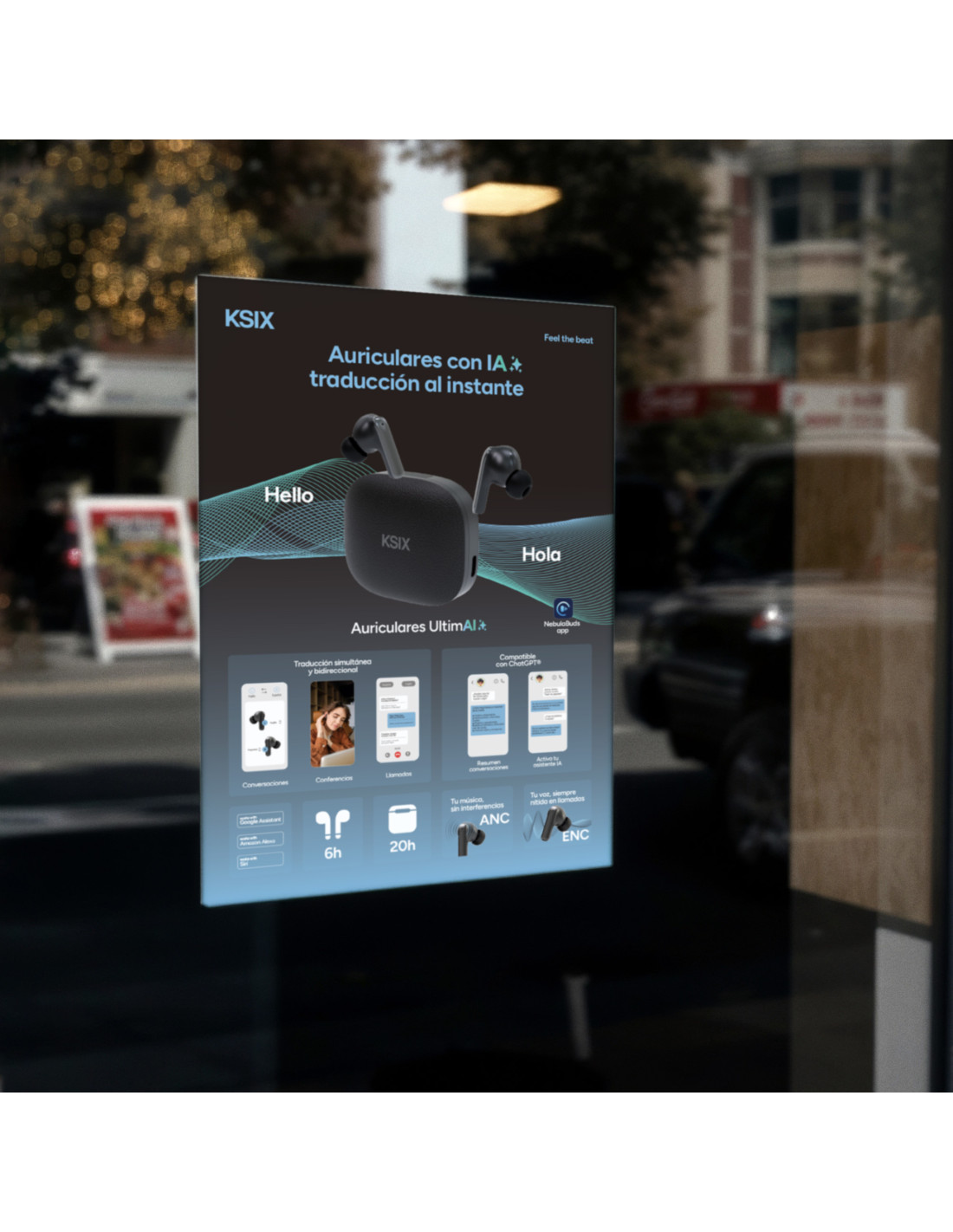 KSIX poster to highlight the KSIX UltimAI earphones at the point of sale. Its design reinforces the brand image and attracts the end consumer, increasing the visibility and sales of KSIX products.