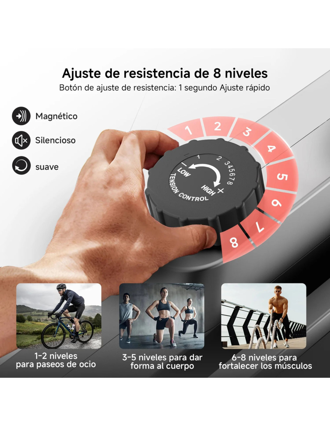 It features 8 resistance levels that allow you to adjust the intensity of your workout according to your fitness level or the type of session you want to perform. From light pedalling to stay active to more intense effort, adapting progressively to your pace.