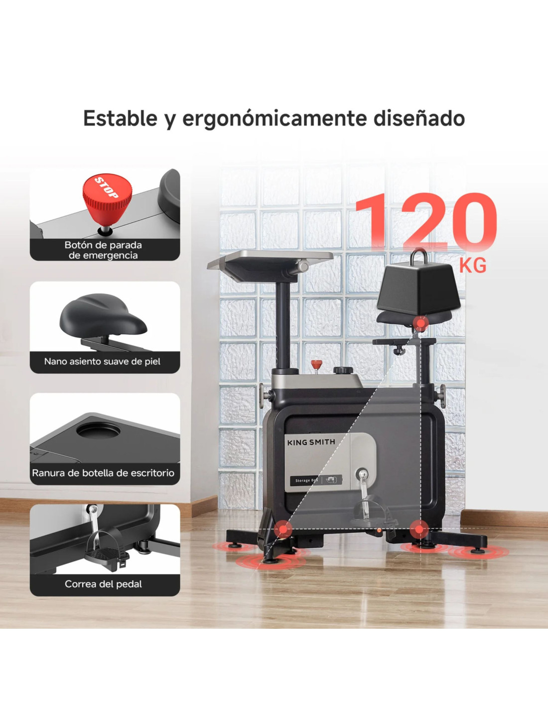 Incorpora un botón de parada inmediata SafeStop que permite detener el funcionamiento de forma rápida y sencilla en cualquier momento. Diseñada para soportar un peso máximo de usuario de hasta 120 kg, ofrece un extra de control para una experiencia de uso más segura y confiable.