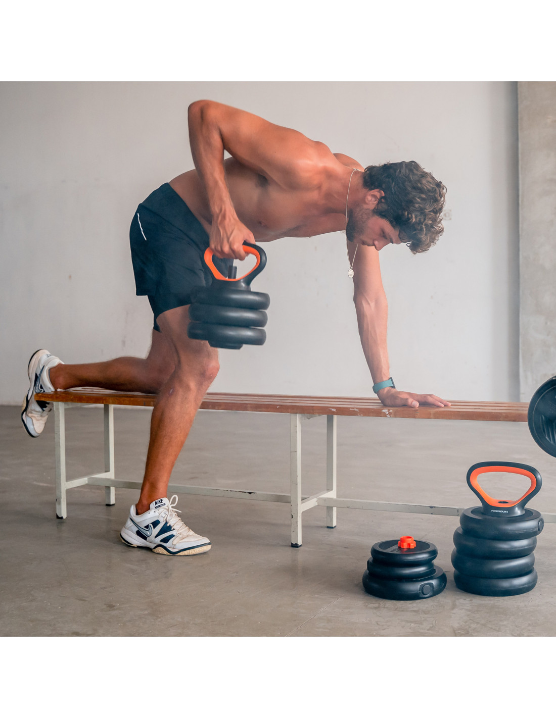 El kit incluye varios discos de distintos pesos, juntamente con barras y soportes para pesas rusas, permitiendo personalizar todo tu equipo.
