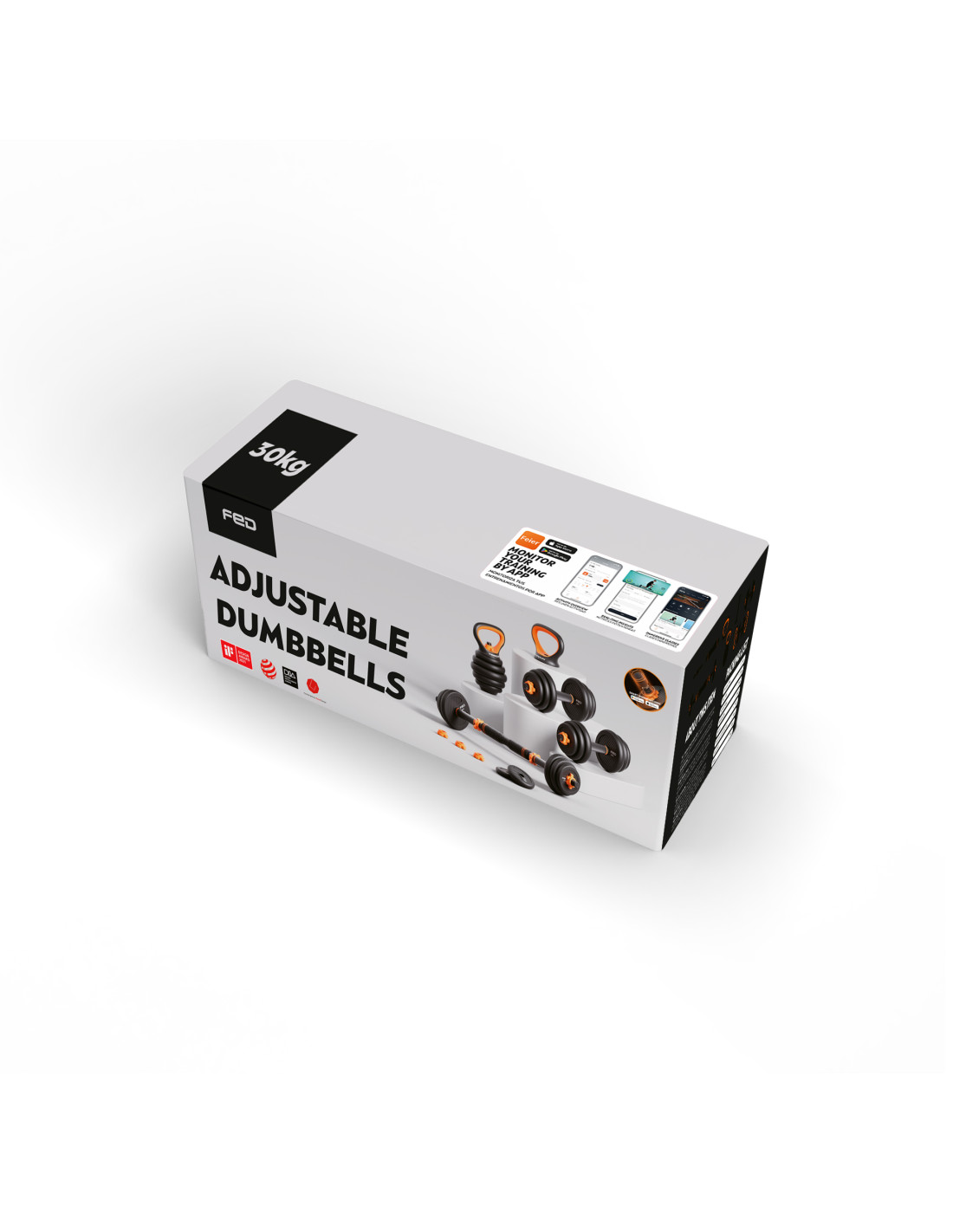 Pack que incluye el kit de FED, con mancuernas, pesas rusas y barra de peso con hasta 30 kg, además del sensor FED, que monitorea tus sesiones de entrenamiento.