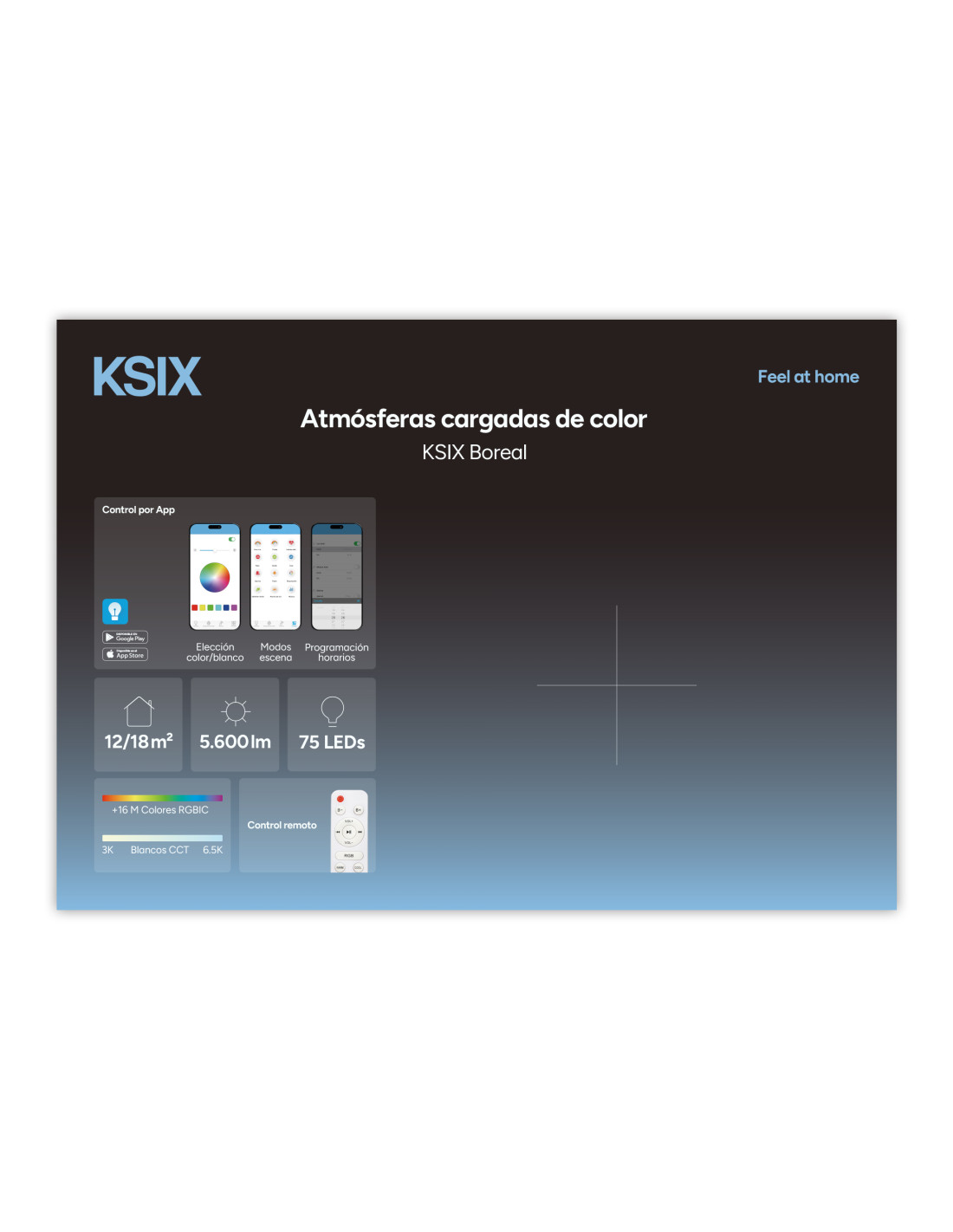 Soporte diseñado para exhibir el plafón KSIX Boreal en el punto de venta, fijando el producto directamente sobre el panel. Presenta la información esencial para destacar sus ventajas y facilitar la elección del cliente final.