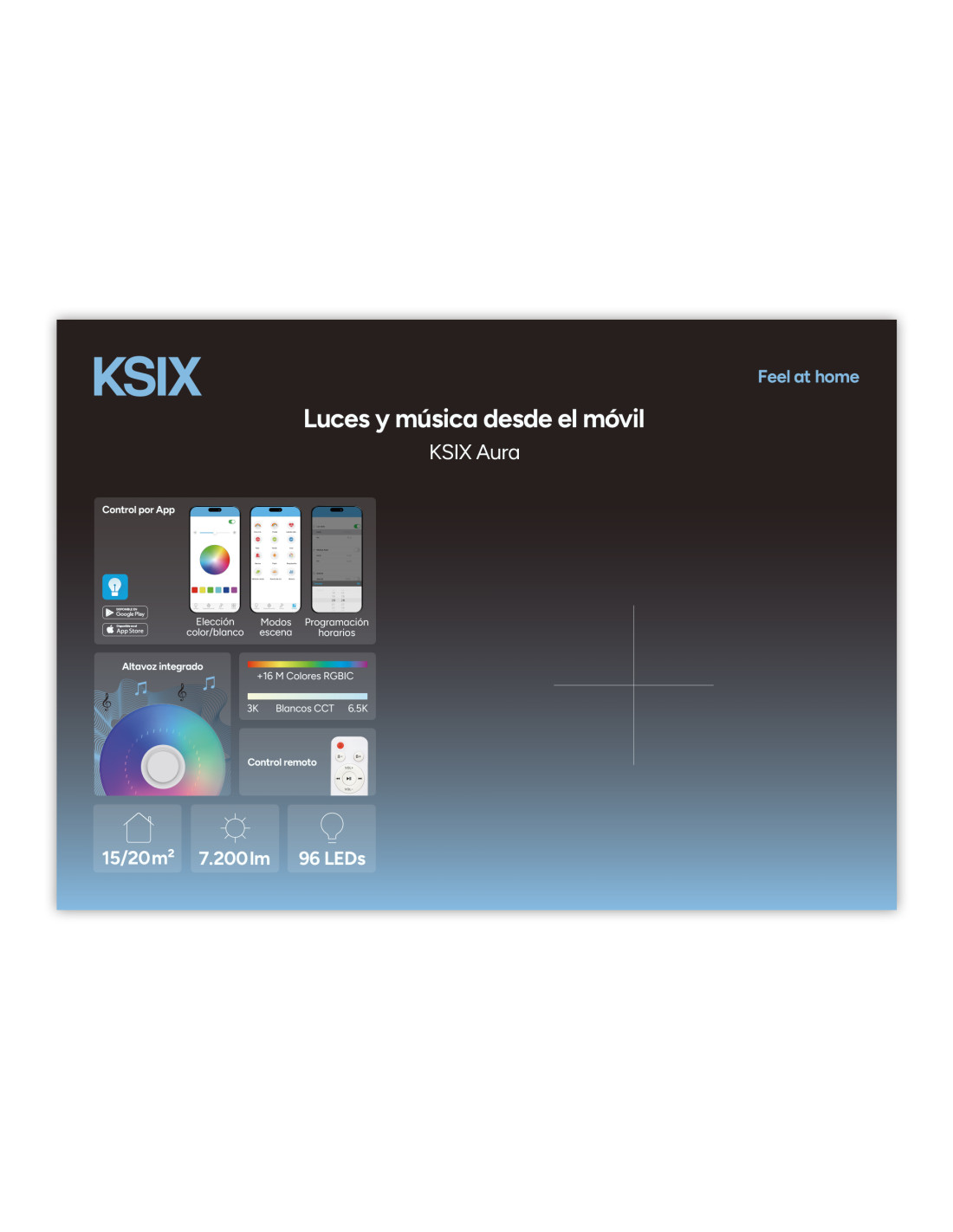 Soporte diseñado para exhibir el plafón KSIX Aura en el punto de venta, fijando el producto directamente sobre el panel. Presenta la información esencial para destacar sus ventajas y facilitar la elección del cliente final.