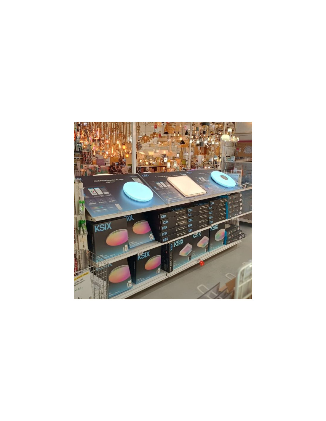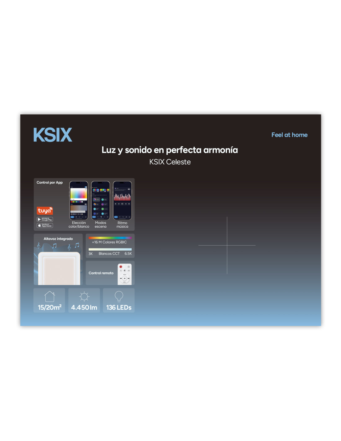 Soporte diseñado para exhibir el plafón KSIX Celeste en el punto de venta, fijando el producto directamente sobre el panel. Presenta la información esencial para destacar sus ventajas y facilitar la elección del cliente final.