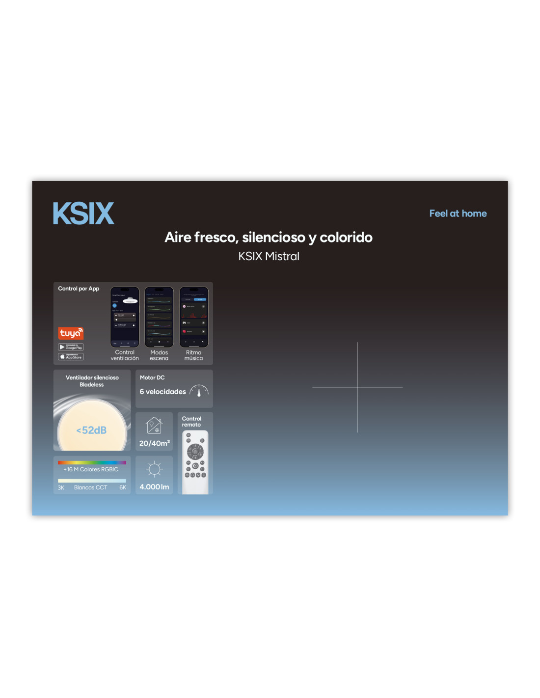 Soporte diseñado para exhibir el ventilador-plafón KSIX Mistral en el punto de venta, fijando el producto directamente sobre el panel. Presenta la información esencial para destacar sus ventajas y facilitar la elección del cliente final.