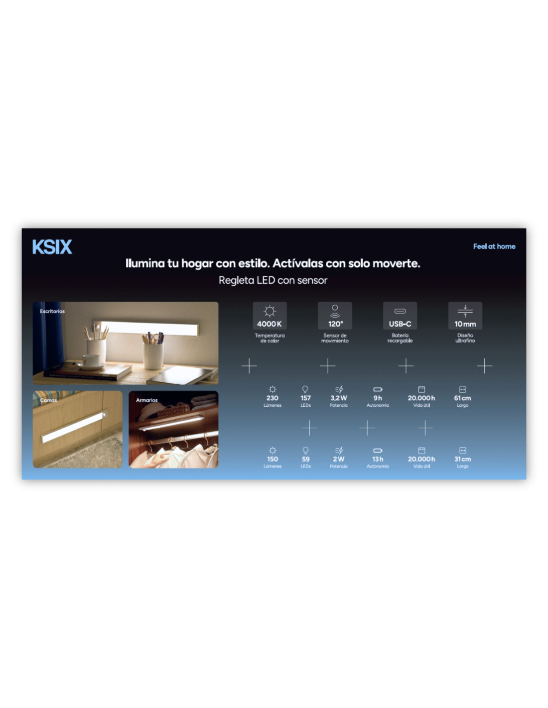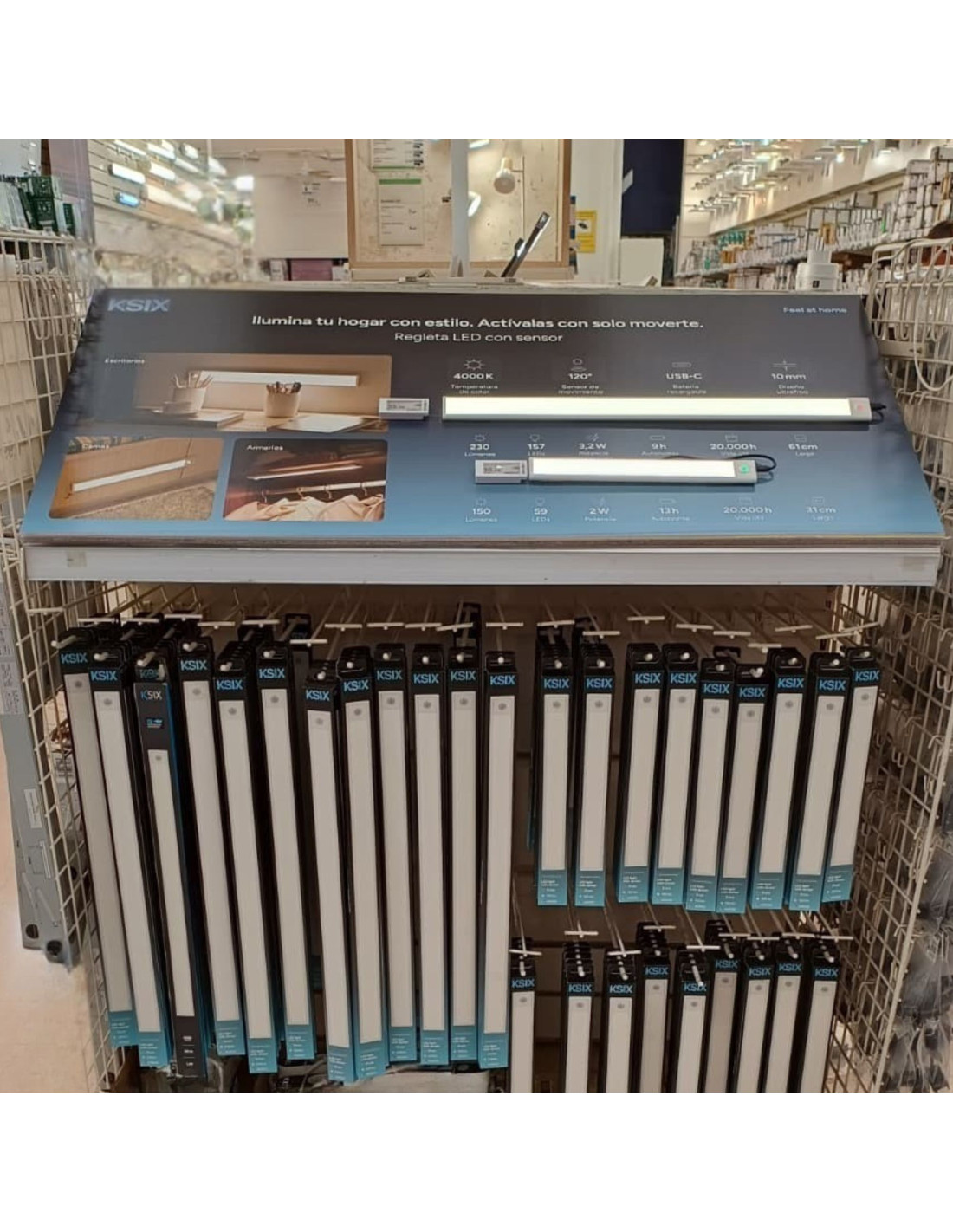 Soporte diseñado para exhibir las regletas LED KSIX Sophia en el punto de venta, fijando el producto directamente sobre el panel. Presenta la información esencial para destacar sus ventajas y facilitar la elección del cliente final.