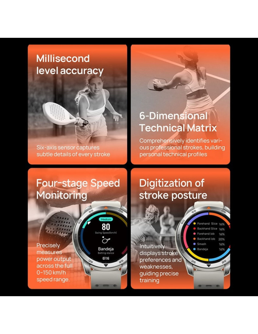 El Mibro smartwatch GS Pro 2 incorpora en exclusiva un modo pádel de última generación que ofrece un análisis técnico con precisión de milisegundos, ideal para entender mejor cada movimiento. Gracias a su matriz de datos en 6 dimensiones, monitoriza postura, velocidad y ritmo de juego en cuatro fases clave.